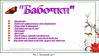 Подготовка страницы «Бабочки сумеречные или бражники» (вставка картинки, надписи, объекта WordArt и установка положения объектов на странице) (рис.3).