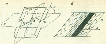 Линия простирания — линия (А—Б), образующаяся при пересечении поверхности пласта с горизонтальной плоскостью. Направление линии простирания называется простиранием пласта. Простирание характеризуется азимутом — углом между магнитным меридианом и линией простирания (как и любой другой линией). Этот угол отсчитывается от северного направления меридиана по часовой стрелке. Азимут определяется с помощью горного компаса. Линия падения — линия (В—Г), лежащая в плоскости (и на поверхности) пласта, перпендикулярная к линии простирания. Она направлена в сторону наибольшего уклона. Падением пласта называют его наклон к горизонтальной плоскости. Направление, противоположное падению пласта, есть восстание последнего. Угол, составленный поверхностью (кровлей) пласта и горизонтальной плоскостью, называется углом падения.