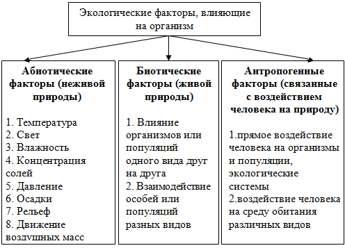 Мы рассмотрим влияние первых трех абиотических факторов среды, так как их влияние более значительно – это температура, свет и влажность.