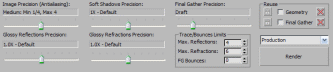 - Rays per FG point (Лучей на точку Финальной Сборки) – определяет количество лучей, задействованных для просчета отраженного освещения, зависит от выбранной настройки FG Precision Present (Выбор точности). Большое значение этого параметра увеличивает время визуализации.