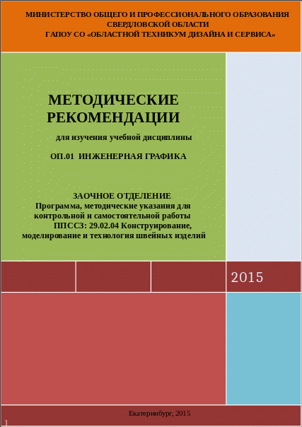 Методические рекомендации составлены для изучения и выполнения работ по учебной дисциплине ОП.01 «Инженерная графика», соответствуют требованиям ФГОС и предназначены для реализации государственных требований к минимуму содержания и уровню подготовки выпускников ГАПОУ СО «Областной техникум дизайна и сервиса» по специальности 29.02.04. «Конструирование, моделирование и технология швейных изделий» заочной формы обучения и отвечает требованиям, обеспечивающим соответствующую квалификацию Технолог-конструктор.