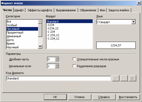 Числовой формат – для основного отображения чисел. В его настройках можно задать количество отображаемых знаков после запятой, применение разделителя групп разрядов, а также способ отображения отрицательных чисел.