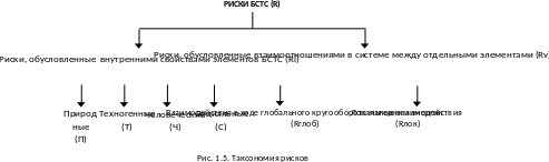 Існує ціле «дерево причин», що викликає те або інше негативне явище. У нашій роботі ми спробуємо виявити так звані першопричини (першоджерела, «коріння») і провести за цією ознакою класифікацію ризиків. Пропонована таксономія ризиків за класифікаційною ознакою «джерела ризику» представлена на мал. 1.5, на мал. 1.6 показана структура ризиків.