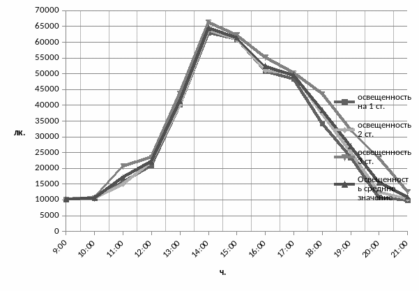Рис. 25 График сравнения освещенности на 3 станциях и среднего значения