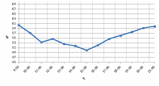 График построен по данным таблице 6. На графике показана зависимость влажности от влажности с минимальными и максимальными значениями, нижними и верхними пиками. Пики плавные и не ясные. Верхний пик 1, 54,6% в 12:00. Нижних пиков 2, первый пик в 11:00-53,2%, второй нижний пик в 15:00 равный 49,9, он же является минимумом. Влажность зависит от облачности, температуры, скорости ветра.