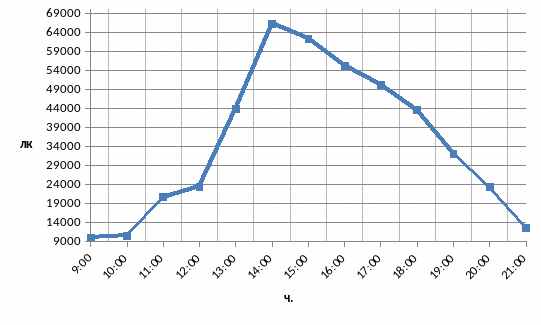 График построен по данным таблице 6. На графике показана зависимость освещенности от времени с минимальными и максимальными значениями, нижними и верхними пиками. Верхних пика 2, первый 20700 в 11:00, второй- в 14:00 равный 66300, является максимумом, нижний пик 1, в12:00 равен 23400,пики плавные. Освещенность зависит от положения солнца, облачности, скорости ветра.