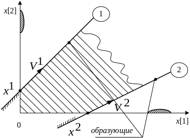 Образующей не пустого выпуклого многогранного множества D в n-мерном Евклидовом пространстве называется такое его ребро, которое имеет бесконечно удаленную точку. Уравнение образующей записывается в векторной форме следующим образом:
