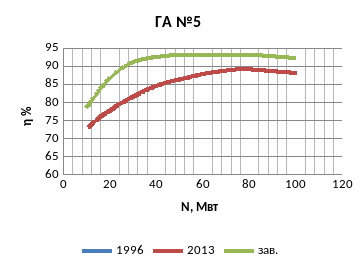 Сравнивая энергетических характеристик ГА на примере рабочих характеристик ГА Воткинской ГЭС по данным заводской характеристики и характеристик, полученных путём натурных испытаний в 1996 и 2013 г.г, потери мощностей почти одиноковые при рабочих мощностей до 70 МВт. А После 70МВт, потери мощности 2013ого года уменьшились с 1966-ого года.Это может быть из-за предсказа экплуатиционных характеристик 1996-ого года чтобы получить их зависимость до 100 МВт рабочей мощности. То они потери 1996-ого года приблизительные. Из этого можно сделать вывод что КПД гидроагрегатов Воткинсковой Станции не ухудшились в течение этих времени.