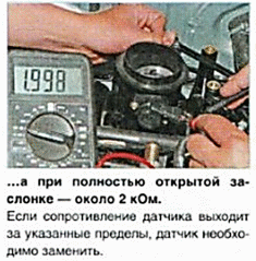 3. Для проверки исправности датчика положения дроссельной заслонки подсоединяем щупы омметра к выводам датчика «В» и «С» (обозначения выводов нанесены на колодке жгута проводов). Поворачивая за сектор привода, открываем дроссельную заслонку. При этом у исправного датчика положения дроссельной заслонки сопротивление должно равномерно возрастать с 2,7 до 8,2 кОм.
