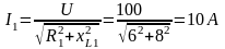 Пример 4.Катушка с активным сопротивлением R1=6 Ом и индуктивнымxL1=8 Ом соединена параллельно с конденсатором, емкостное сопротивление которого xC2= 10Ом (рис. 4, а). Определить: 1) токи в ветвях I1 иI2 и дв неразветвленной части цепиI; 2) активныеPи Qреактивные мощности ветвей и всей цепиS; 3) полную мощность цепи; 4) углысдвига, фаз между током и напряжением в каждой ветви и во всей цепи. Начертить в масштабе векторную диаграмму цепи. К цепи приложено напряжение U=100 В.