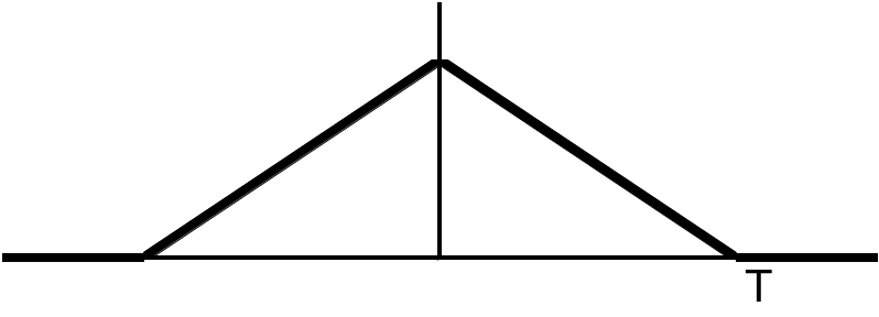 Если τ<Т, то возможны два варианта: случай А, когда они принадлежат одному интервалу и , следовательно, X(t1)X(t1+τ)=1, и случай В, когда они принадлежат разным тактовым интервалам и X(t1)X(t1+τ) может с равной вероятностью равняться +1 и -1. Поэтому при τ<Т математическое ожидание X(t1)X(t1+τ) равно вероятности р(а) того, что оба сечения оказались в одном интервале. Случай А имеет место, если первое из двух сечений отстоит от начала тактового интервала не более чем Т-|τ|, а вероятность этого равна (Т-|τ|)/Т.