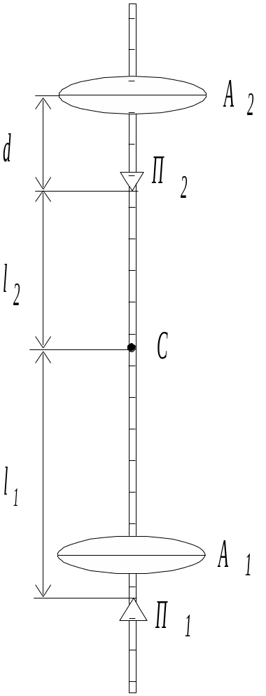 1. Готовят оборотный маятник к измерениям. Опорные призмы рекомендуется расположить на расстояниях 20 - 25 см от концов маятника. Подвижную чечевицу последовательно перемещают с шагом 1-2 см от конца маятника к призме П2. В отчете выполняют чертеж маятника с указанием всех размеров, определяющих геометрию маятника.