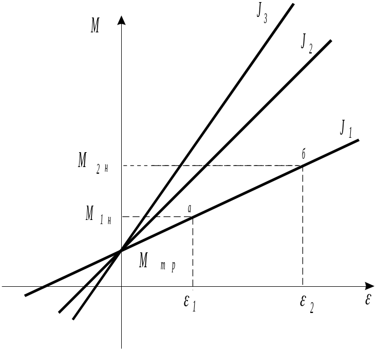 Согласно (2.3) Мн линейная функция e. На рис. 7 эти зависимости для различных зна-чений моментов инерции системы изображены в виде графиков, угловые коэффициенты которых равны J. Эти графики отсекают от оси Мн отрезки, равные моменту силы трения Мтр. Так как Мтр одинаков во всех опытах, то все графики должны пересекаться в одной точке. Функция (2.3) верна для любых двух моментов сил, поэтому