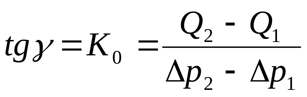 Если индикаторная диаграмма - прямая линия, что отмечается при фильтрации однофазной жидкости (нефти, воды) или водонефтяной смеси по закону Дарси, то как тангенс угла, наклона линии (по индикаторной диаграмме находим две удаленные точки с координатами ∆p1, Q1 и ∆p2,Q2) определяем: