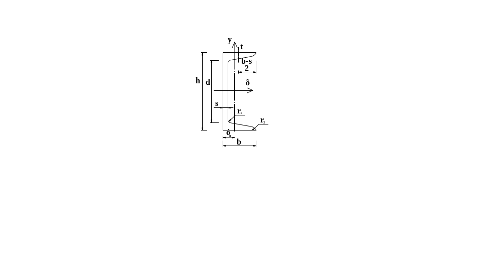 - для швеллера с указанием внутренних граней полок (рис.1.3) и с параллельными гранями полок (рис.1.4): h(мм) - высота сечения, b(мм) - ширина сечения, t(мм) - толщина полки, s(мм) - ширина стенки, A(см2) - площадь поперечного сечения,