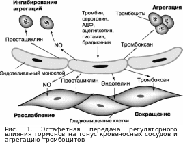 Многие гормоны, имея гидрофильную природу, не могут проникать через эндотелиальный барьер вглубь сосуда, а затем достигать определенного органа. Они действуют на эндотелиальные клетки и вызывают в них образование новых межклеточных регуляторов: эндотелина (пептидный гормон) и тромбоксана (про-станоид, образующийся из арахидоновой кислоты), которые стимулируют сокращение гладкомышечных клеток в стенке сосуда, а также агрегацию тромбоцитов (рис. 1). Эти же гормоны стимулируют образование в эндотелиальных клетках простациклина (про-стагландин I2) и оксида азота (NO), которые вызывают расслабление гладкомышечных клеток и препятствуют агрегации тромбоцитов. Таким образом, в результате секреторной активности эндотелия могут произойти либо сужение сосуда и усиление тромбоза (если секреция тромбоксана и эндотелина превышает секрецию простациклина и NO), либо расширение сосуда и ослабление тромбоза (если секреция тромбок-сана и эндотелина окажется слабее, чем секреция простациклина и NO).