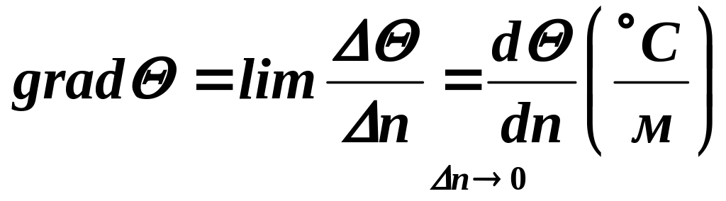 Скорость изменения температуры в точке А тела при переходе от одной изотермы к другой будет максимальной вдоль нормали (n). Эта скорость определяется отношением ΔΘ/Δn.