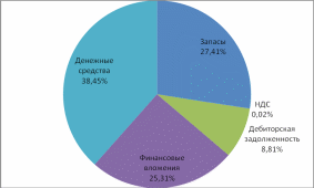 В структуре оборотных активов АО «Салаватстекло» преобладают денежные средства 38,45%, запасы 27,41%, финансовые вложения 25,31% и дебиторская задолженность 8,81%.