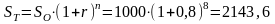 Пример 1. Определить сумму простого процента за год, если SO = 1000 у.е., rкв = 20%. Получим ST = 1 800 у.е., P = 800 у.е.