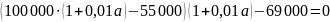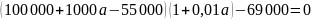 - каждый январь долг возрастает на a% по сравнения с концом предыдущего года; - февраля по июнь каждого года необходимо выплатить часть долга. Найдите число a, если известно, что кредит был полностью погашен за два года, причём в первый год было переведено 55 000 рублей, а во второй год 69 000 рублей?