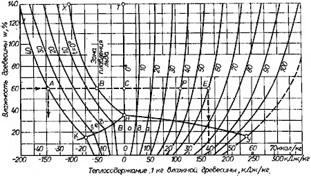 На оси абсцисс нанесены искомые расходы тепла, на оси ординат — влажность древесины. Горизонтальный отрезок АВ показывает расход тепла на подогрев до 0 °С древесины и заключающегося в ней льда с температурой -40 °С, отрезок ВС—на плавление льда, отрезок СЕ— на нагревание древесины и жидкой влаги в ней от 0 до 60 °С.