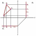 Фронтальная плоскость, заданная треугольником АВС (рисунок 46), изображена проекциями А1В1С1, А2В2С2 и А3В3С3. При этом горизонтальная и профильная проекции изображаются отрезками прямых линий, а фронтальная – треугольником, который равняется истинной величине треугольника АВС, т.к. он в пространстве занимает параллельное положение относительно плоскости проекций П2.