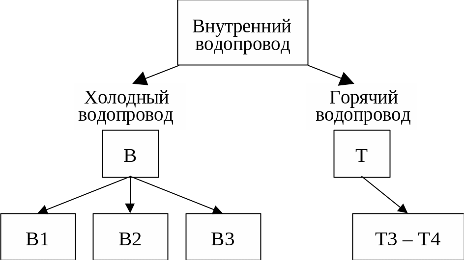 Таким образом, внутренний водопровод подразделяется в первую очередь на холодный (В) и горячий (Т) водопровод. На схемах и чертежах в отечественной документации холодные водопроводы обозначают буквой русского алфавита B, а горячие — буквой русского алфавита Т.