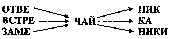 Ребенок должен составить ряд слов таким образом, чтобы последний слог первого слова стал первым слогом следующего: рыба — баран — ранка — калоши — шина...; молоко — корова —• валенки...