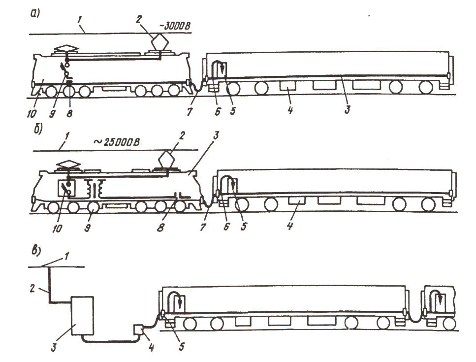 а) на участках, электрифицированных на постоянном токе – электрическая энергия с тяговой подстанции через контактный провод 1, пантограф 2 электровоза 10, и установленные в нем быстродействующий выключатель 9 и контактор отопления 8, через междувагонное высоковольтное электрическое соединение 7, поступает в подвагонную высоковольтную магистраль 3, и в подвагонный контакторный ящик 4. А уже оттуда по отводу 6, к высоковольтным нагревательным элементам, установленным в котле 5.