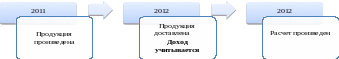 Пример 1. Рассмотрим организацию «Айбат», производящую и реализующую свою продукцию. В 2012 году организация доставила своему клиенту продукцию, произведенную в 2011 году. Доход от реализации продукции будет учтен в 2012 году (Иллюстрация 3.5).