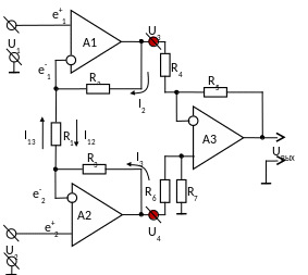 А1 и А2 – неинвертирующие усилители с большими входными сопротивлениями (и одинаковыми).