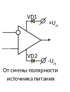 При работе в линейном режиме выходное напряжение возрастает при уменьшении напряжения на инвертирующем входе (е-) или при увеличении напряжения на неинвертирующем входе (е+).