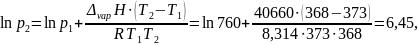 Пример: Определим теплоту испарения этанола, если его температура кипения при давлении 13,33 кПа составляет 34,9°С, а при давлении 101,325 кПа равна78,4°С.