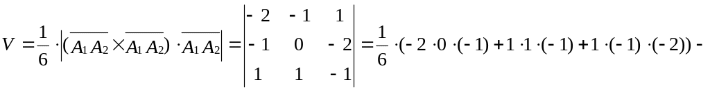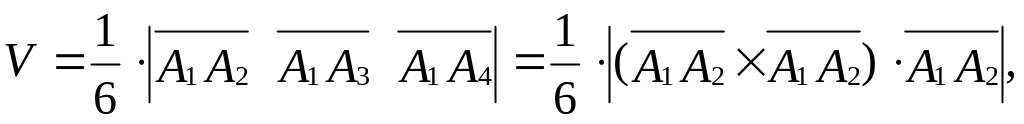 4. Объем V пирамиды найдем, используя геометрический смысл смешанного произведения векторов, совпадающих с ребрами пирамиды: