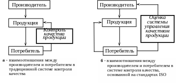 На рис. 3 показаны взаимоотношения между производителем и потребителем в традиционной системе контроля качества продукции (а) и системе контроля качества, основанной на стандартах ISO 9000 (б).