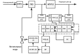 Токовый сигнал (4..20 мА) от датчика температуры пара после пароперегревателя (ТХАУ Метран-271) поступает на аналоговый вход модуля МАС-Д, после чего цифровой сигнал по кабелю «витая пара» с выхода модуля МАС-Д поступает на вход блока контроллера БК-500. Туда же поступает сигнал от задатчика с операторской станции через интерфейс Ethernet. Сформированный по ПИ-закону алгоритмом РАН сигнал токовый подается на вход алгоритма РИМ, туда же поступает сигнал с датчика температуры пара после пароохладителя (через модуль МАС-Д) и результирующий сигнал, сформированный по ПИ-закону алгоритмом РИМ, поступает на модуль дискретного вывода (по кабелю «витая пара») МСД-Д. Дискретный сигнал от МСД-Д через блок ручного управления БР поступает на блок управления электродвигателем БУЭР1-30, а от него на исполнительный механизм МЭОФ-250/25, который воздействует на регулирующий орган, изменяя расход питательной воды на пароохладитель.