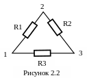 Более сложный пример определения значений сопротивлений резисторов, соединенных по схеме треугольника (рисунок 2.2). Здесь измеряют сопротивления между каждой парой вершин треугольника и получают систему уравнений