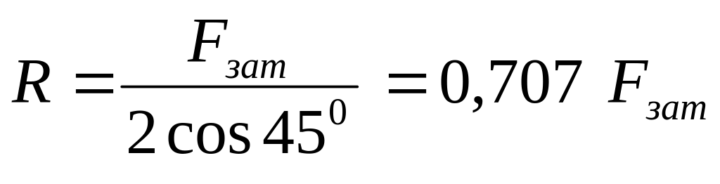 Знаходимо сили, які діють на заготовку з боку затискання. Прихват затискного пристрою, що діє на заготовку з силою затискання Fзат створить в точках її дотику до опорних поверхонь дві сили реакції R (рис. 7.5).