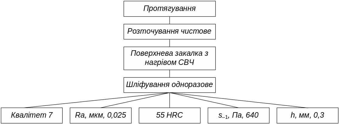 Матеріал деталі містить С = 0,4 %. З урахуванням вимог до фізико-механічних властивостей поверхневого шару пропонується виконання зміцнення (див. табл. Д.1.2) — поверхневе гартування з нагріванням СВЧ. Уся послідовність способів обробки представлена на рис. 2.2.