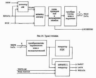 Микроконтроллер имеет четыре порта, с помощью которых он подключается к HOST, локальному микропроцессору, RAM буферу и каналу обмена данными с НЖМД. Микроконтроллер представляет собой конечный автомат управляемый со стороны локального микропроцессора, со стороны HOST доступны только стандартные регистры файла задания. Программирование однокристального микроконтроллера производиться на этапе инициализации со стороны локального микропроцессора, при этом происходит настройка на один из трех методов кодирования MFM, RLL или NRZ, выбирается режим CRC или ЕСС [3], устанавливается режим гибкого или жесткого разбиения на сектора (гибкий режим используется в НЖМД IDE AT с зонно-секционной записью, см. ниже). Локальный микропроцессор управляет менеджером буфера, контроллером НЖМД и режимом работы контроллера интерфейса (некоторые микроконтроллеры могут работать в режиме AT или XT). Как правило, локальный микропроцессор находиться в состоянии ожидания пока не активизирован запрос микроконтроллера MCINT (MICROCONTROLLER INTERUPT). В режиме AT, MCINT устанавливается, когда HOST производит запись в командный регистр 1F7H . Менеджер буфера управляет буферным ОЗУ, емкость которого колеблется от 8 Кбит до 256 Кбит и зависит от конкретного используемого микроконтроллера. Менеджер буфера разбивает все буферное ОЗУ на отдельные секторные буферы. Специальные регистры, доступные со стороны локального микропроцессора, содержат начальные адреса этих секторных буферов. Когда HOST осуществляет обмен данными с одним из секторных буферов посредством FIFO, со стороны контроллера НЖМД возможен обмен данными с другим секторным буфером. Контроллер управления НЖМД предназначен для обмена данными между каналом чтения/преобразования данных, каналом записи НЖМД и совместно с менеджером буфера - буферным ОЗУ, дополнительно контроллер управления НЖМД осуществляет форматирование дорожки, поэтому в справочной документации можно встретить название форматер и дисковый интерфейс (FORMATTER & DISK INTERFACE). На рис.5 представлены тракт чтения контроллера управления НЖМД и тракт записи. При выполнении чтения, с сепаратора данных, приходит управляющий сигнал DRUN (при нахождении поля синхронизации). По этому сигналу детектор адресного маркера, во входном потоке данных пытается обнаружить AM и если он обнаружен, то подается сигнал START на декодер, который начинает преобразование входных данных в двоичный последовательный код. Схема проверки КЦК и исправления ошибок обнаруживает и если возможно корректирует ошибки, по результату проверки формируется сигнал NO ERRORS. После этого последовательные данные преобразуются в параллельные. При выполнении записи байт данных преобразуется в последовательный код и поступает в схему генератора RLL, который с частотой WCLK вырабатывает данные записи WRDATA. В зависимости от комбинации битов данных формируются сигналы коррекции EARLY и LATE, используемые схемой предкомпенсации. Схема генератора КЦК подсчитывает контрольно-циклический код входного потока последовательных данных. Сформированные байты КЦК добавляются к записываемым данным. По сигналу WRITE AM генератор RLL формирует байт адресного маркера (сформированного с нарушением правил кодирования).