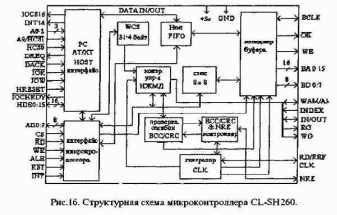 He так давно самым распространенным однокристальным микроконтроллером являлся CL-SH260 и его модернизированный аналог CL-SH265. Этот контроллер использовался приблизительно в 60% всех выпускаемых НЖМД IDE AT емкостью 100 - 200 Мбит. Микроконтроллер AIC-6060 совместим по разводке выводов и назначению регистров с устройством CL-SH260, но превосходит последний по быстродействию на 50% и содержит дополнительные регистры ветвления с возможностью только записи. Структурная схема микроконтроллера CL-SH260 представлена на рис. 16.