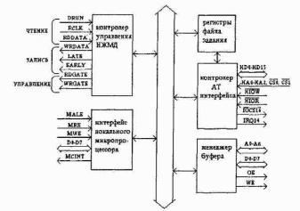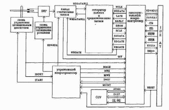 INDEX - сигнал вырабатываемый схемой управления шпиндельного двигателя за один оборот диска; START - разрешение на запуск шпиндельного двигателя; HDO-HDN - двоичный код выбора головки считывания/записи; RDDATARLL - данные чтения RLL; WRDATARLL - данные записи RLL; WF - сигнал вырабатываемый схемой записи при ошибке; WCLK - синхроимпульсы записываемых данных; * WRDATA - данные записи в коде NRZ; LATE, EARLY - сигналы управления режимом предкомпенсации; DRUN - выход детектора поля синхронизации; RCLK - синхроимпульсы считываемых данных; RDDATA - считываемые данные в коде NRZ; RDGATE - строб чтения; WRGATE - строб записи; MALE - строб адреса управляющего микропроцессора; MRE - стоб чтения управляющего микропроцессора; MWE - стоб записи управляющего микропроцессора; DO-D7 - внутренняя шина данных накопителя; MCINT - сигнал прерывания от однокристального микроконтроллера; WE - строб записи для буферного ОЗУ; HDO-HD15, НАО-НА2, /CSO, /CS1, /HIOW, /HIOR, ЯОС816, IRQ 14, RESET - интерфейсные сигналы.