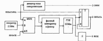 Сепаратор данных и схему предкомпенсации записи очень часто размещают на одном кристалле, хотя между собой они практически не связаны и функционируют совершенно раздельно. Основное назначение сепаратора данных состоит в очистке цифрового сигнала от шумов при чтении и выделении сигналов синхронизации RCLK. Структурная схема сепаратора данных показана на рис.2.
