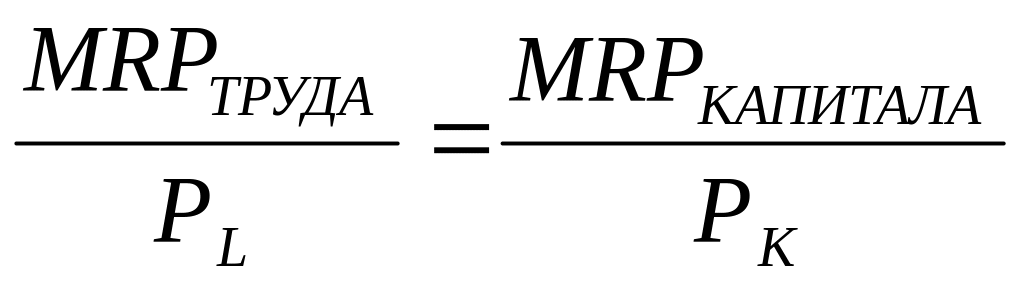 В этом уравнении выражается следующая закономерность: доход от предельного продукта, получаемого за счет дополнительного вложения какого-либо фактора производства, должен равняться рыночной цене этого фактора.