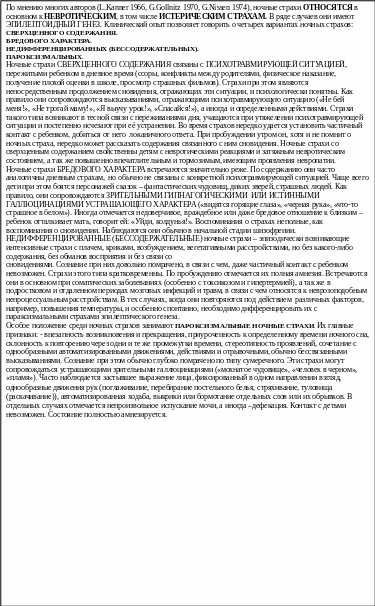 НОЧНЫЕ СТРАХИ: («pavor nocturnus») - сборная группа состояний страха, общими признаками, которых является возникновение во время ночного сна и наличие той или иной степени измененного сознания (чаще типа рудиментарного сумеречного помрачения). Ночные страхи, по данным некоторых авторов (G.Gollnitz 1970), встречаются у 2-3% детей школьного возраста, причем у мальчиков вдвое чаще, чем у девочек. Наблюдаются они преимущественно в дошкольном и младшем школьном возрасте.