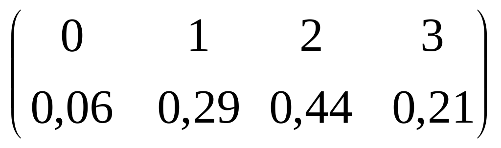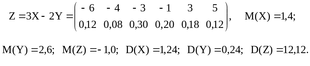 Найти вероятности, с которыми случайные величины принимают значение 3, а затем составить закон распределения случайной величины 3X – 2Y и проверить выполнение свойств математического ожидания и дисперсий: M(3X – 2Y)=3M(X) – 2M(Y), D(3X – 2Y)=9D(X) + 4D(Y).