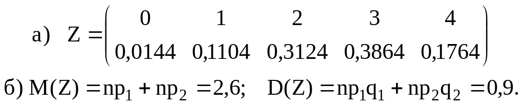 Два стрелка сделали по два выстрела по мишени. Вероятность попадания в мишень для первого стрелка равна 0,6, для второго – 0,7. Необходимо: а) составить закон распределения общего числа попаданий; б) найти математическое ожидание и дисперсию этой случайной величины.