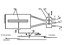 Примером такой системы может служить система регулирования скорости тепловой машины. На рис..изображена схема усилительного устройства, которым дополняется предыдущая система прямого действия, В состав устройства входят: гидравлический цилиндр с поршнем 1; управляющий золотник 2; подвижный шток золотника 3. В качестве дополнительного источника энергии используется гидравлическая насосная станция с давлением рабочей жидкости Рн. Перемещения штока золотника (У) осуществляются в результате движения подвижной втулки 4 центробежного измерителя скорости . Вследствие малых размеров управляющего золотника, требуются небольшие усилия для перемещения подвижного штока золотника. Сила же давления штока гидравлического усилителя на рычаг заслонки 4 (например, при его движении в низ) определяется величиной рабочего давления Рн и площадью поршня 1 и поэтому может быть достаточной для перемещения заслонки даже с учетом возможных сил трения