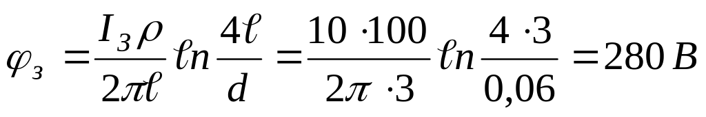 l = 5 м; расстояние от человека до этого участка S = 3 м; диаметр провода 2r = 0,01 м; ток замыкания на землю IЗ = 10 А; ρ = 102 Ом.м; Rn = 103 Ом.