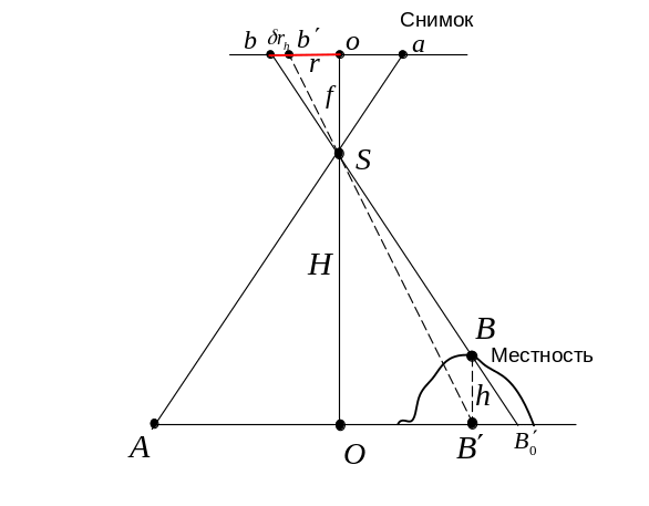 Искажения за рельеф присущи центральной проекции. Они имеются как на плановых, так и на перспективных снимках. Влияние рельефа на фотографическое изображение показано на рисунке 1.